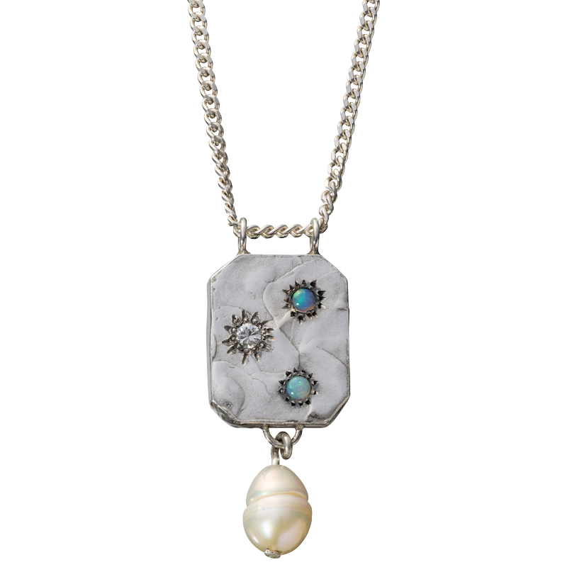 Conçu pour notre édition limitée Fêtes 2025, le pendentif Céleste diamant/opales/perle est minutieusement gravé à la main et orné d’une perle d’eau douce baroque, d’un diamant de laboratoire, d'un saphir jaune et d'un saphir rose.