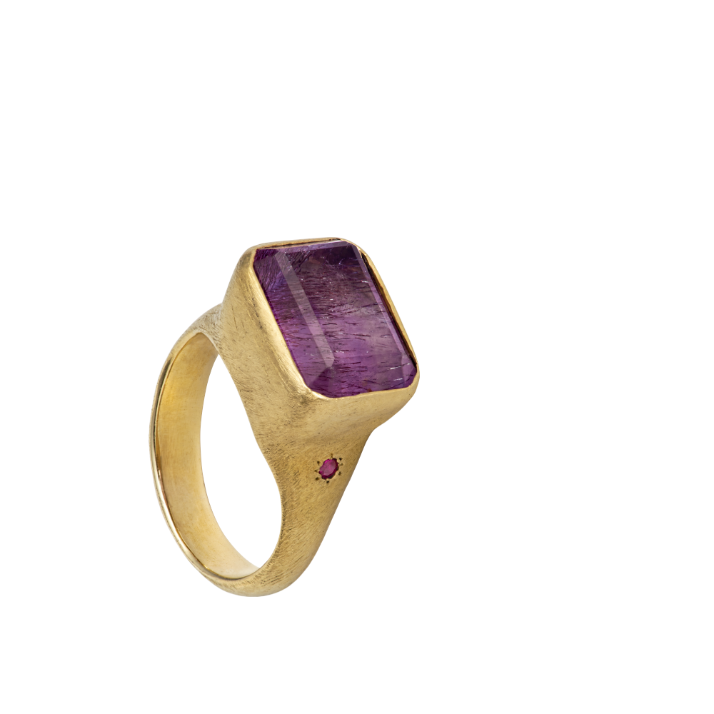 An antique inspired amethyst ring with goethite inclusions. The main stone is accented by two brightly colored rubies and the underside of the band is set with an amethyst.