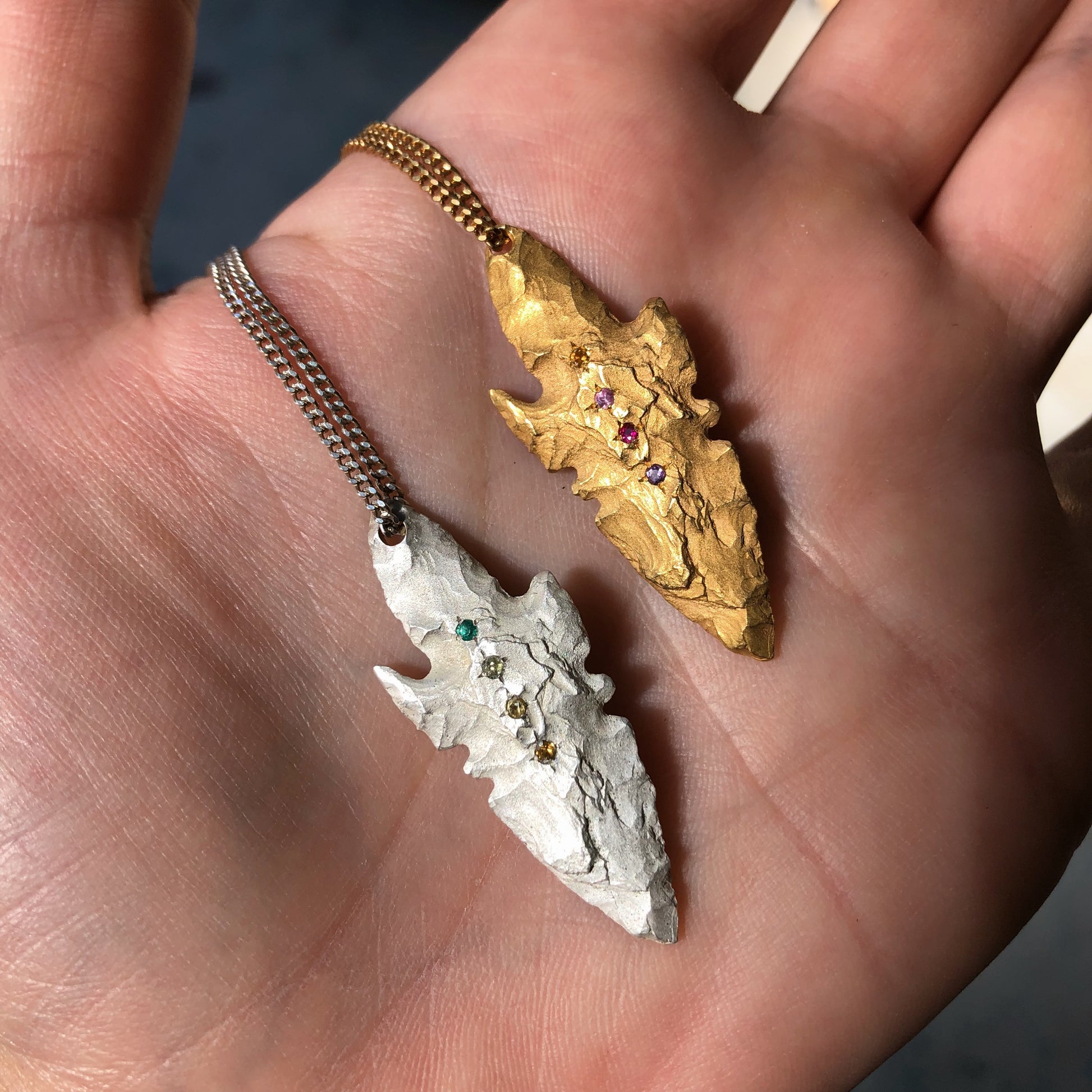 The LITHOS pendant is handmade from the cast of a Neolithic era arrowhead. With its rough shape and precious materials the LITHOS pendant creates a tangible connection between our bodies in the present and the 12000 years that separate us from when it was first hewn.