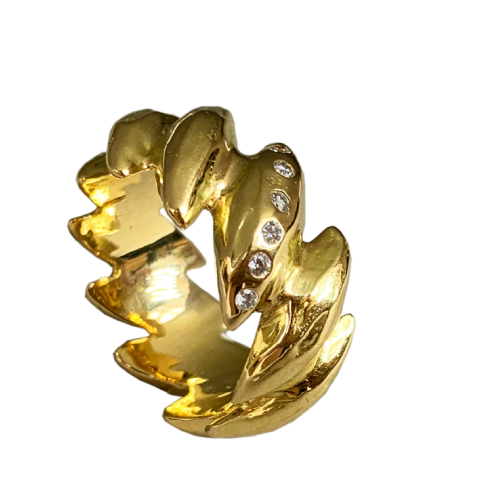 A large twisted band with a fluid texture made from 18-karat Responsible Jewellery Council certified yellow gold, set with 6 lab grown white diamonds.